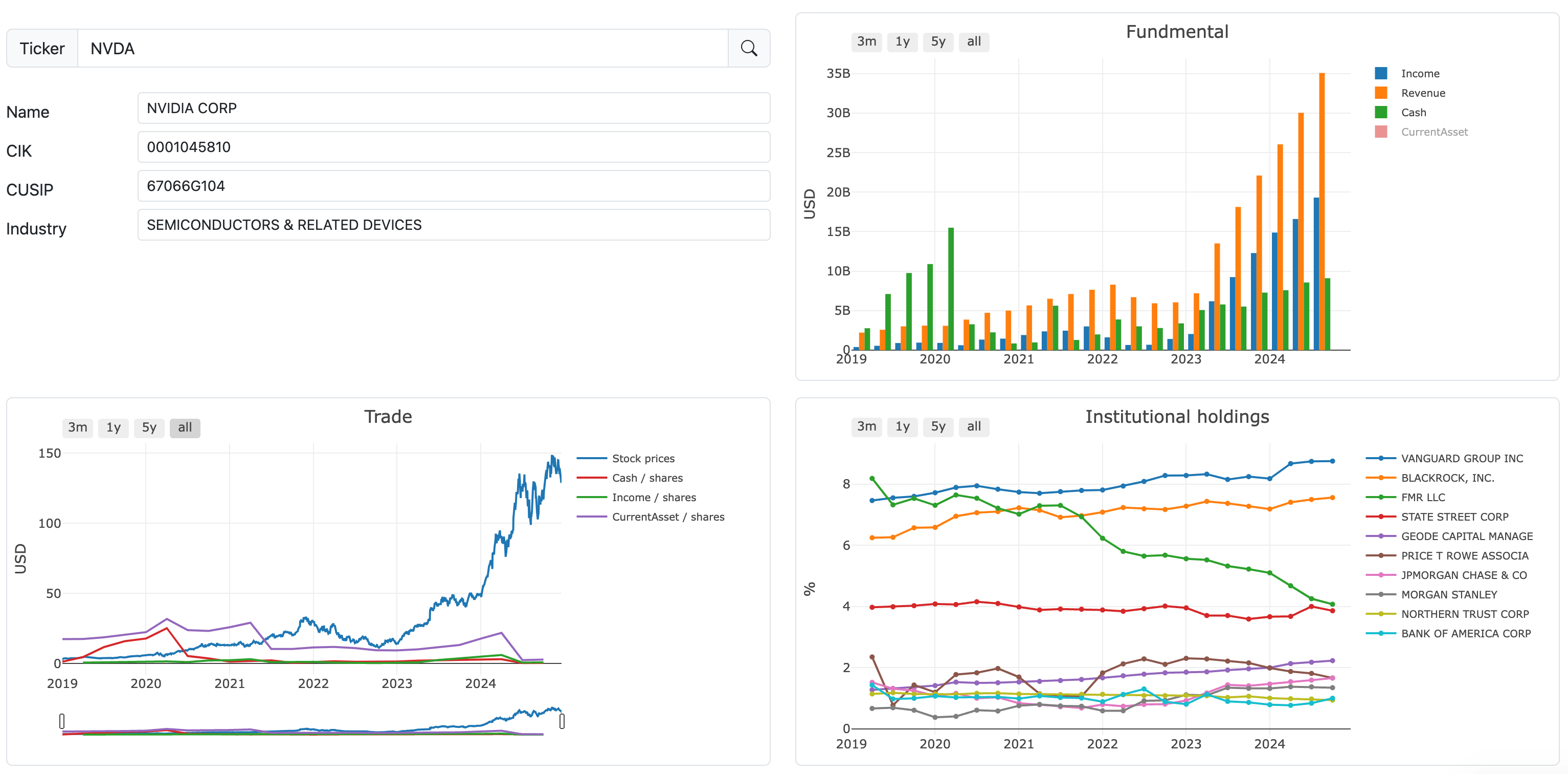 - SEC filings analysis, including company fundamentals, institutional holdings, and more.